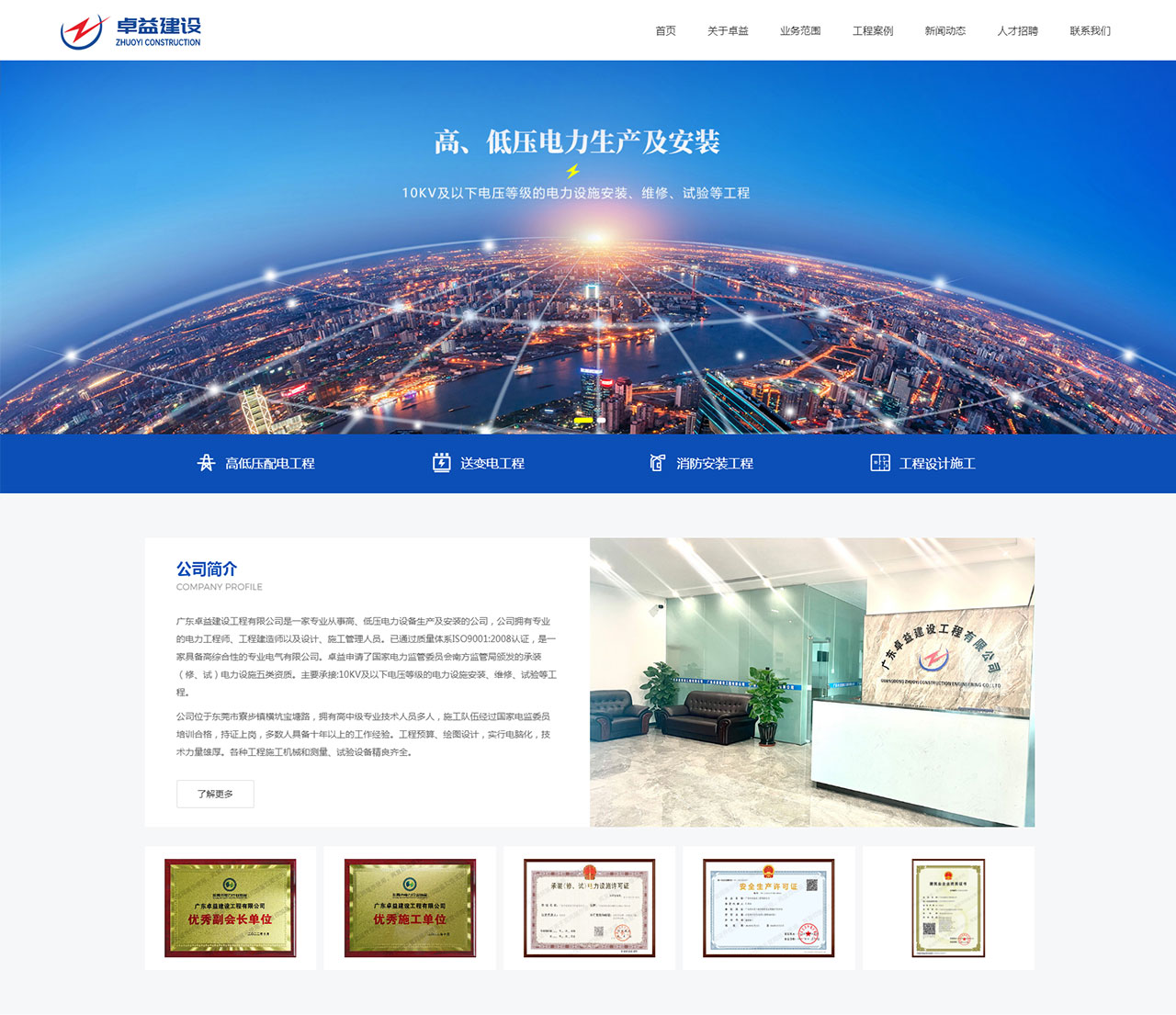 廣東卓益建設工程有限公司是一家專業從事高、低壓電力設備生產及安裝的公司,公司擁有專業的電力工程師、工程建造師以及設計、施工管理人員。已通過質量體系 1SO9001 : 2008 認證,是一家具備高綜合性的專業電氣有限公司。卓益申取了國家電力監管委員會南方監管局頒發的承裝(修、試)電力設施五類資質。主要承接:10KV及以下電壓等級的電力設施安裝、維修、試驗等工程。